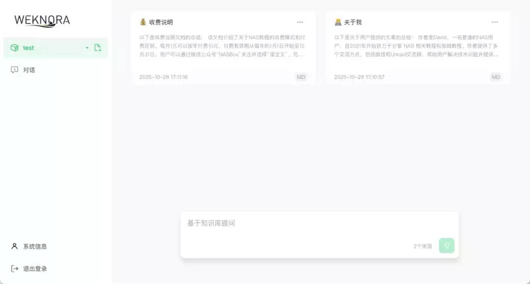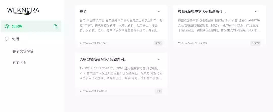 WeKnora 是一款基于大语言模型的文档理解与检索框架,简单来说就是知识库。对接好模型,将需要学习的文档上传到知识库里,就可以对话搜索里面的内容了。不管是企业里整理内部文档、做知识管理,还是科研人员查文献、技术支持查手册,都能派上用场。