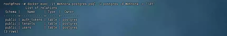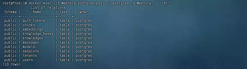 1 | docker exec -it WeKnora-postgres psql -U postgres -d WeKnora -c "\dt" |