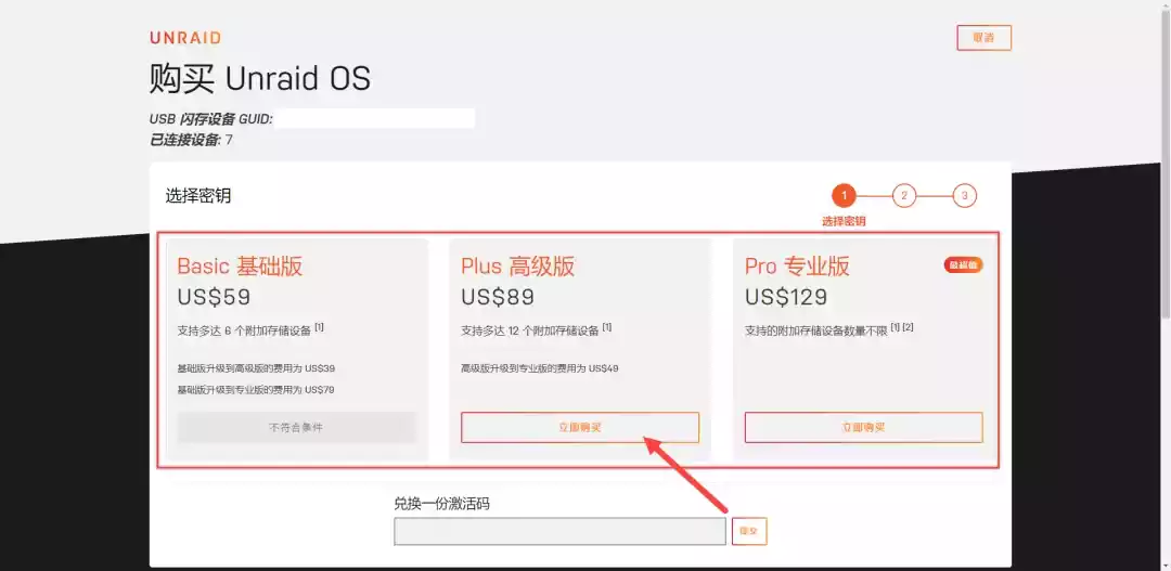 选择需要购买的版本,注意这个页面会显示你的U盘GUID和连接硬盘数量(这里是激活码,不是优惠码,优惠码在后面)
