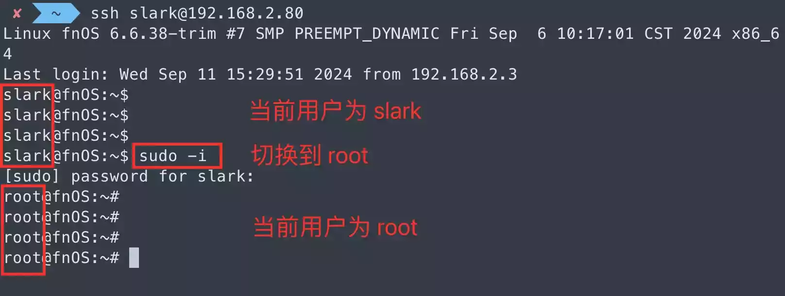 这个身份登录 fnOS,登录之后,终端前面显示的用户名就是 slark