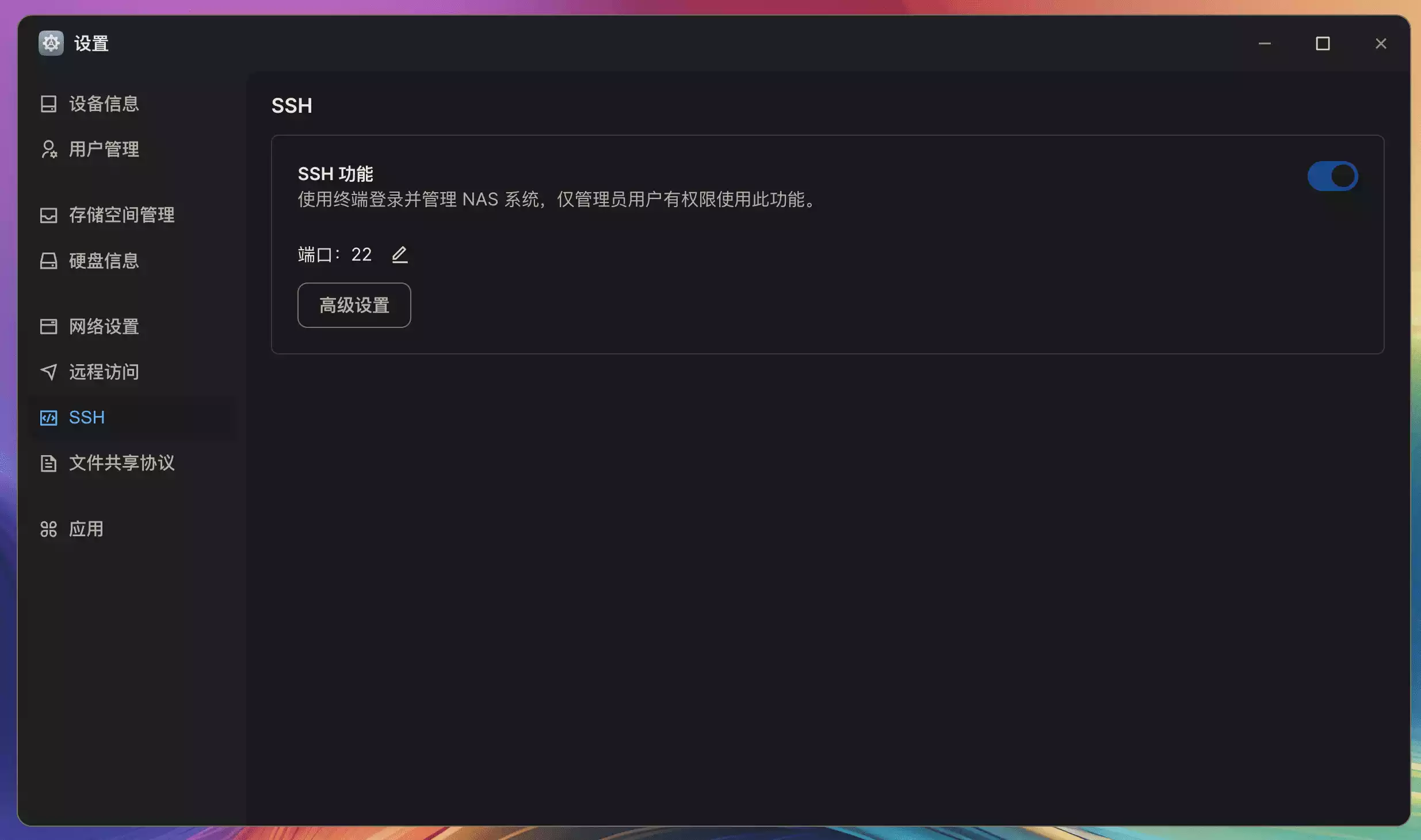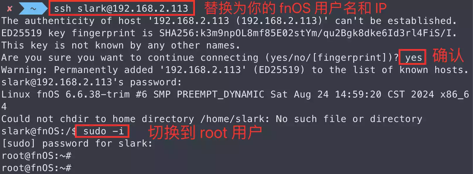 拥有系统最高的权限,所以默认禁止远程登录。你只能先使用管理员账号这个身份通过 SSH 登录到 fnOS,然后使用 sudo -i