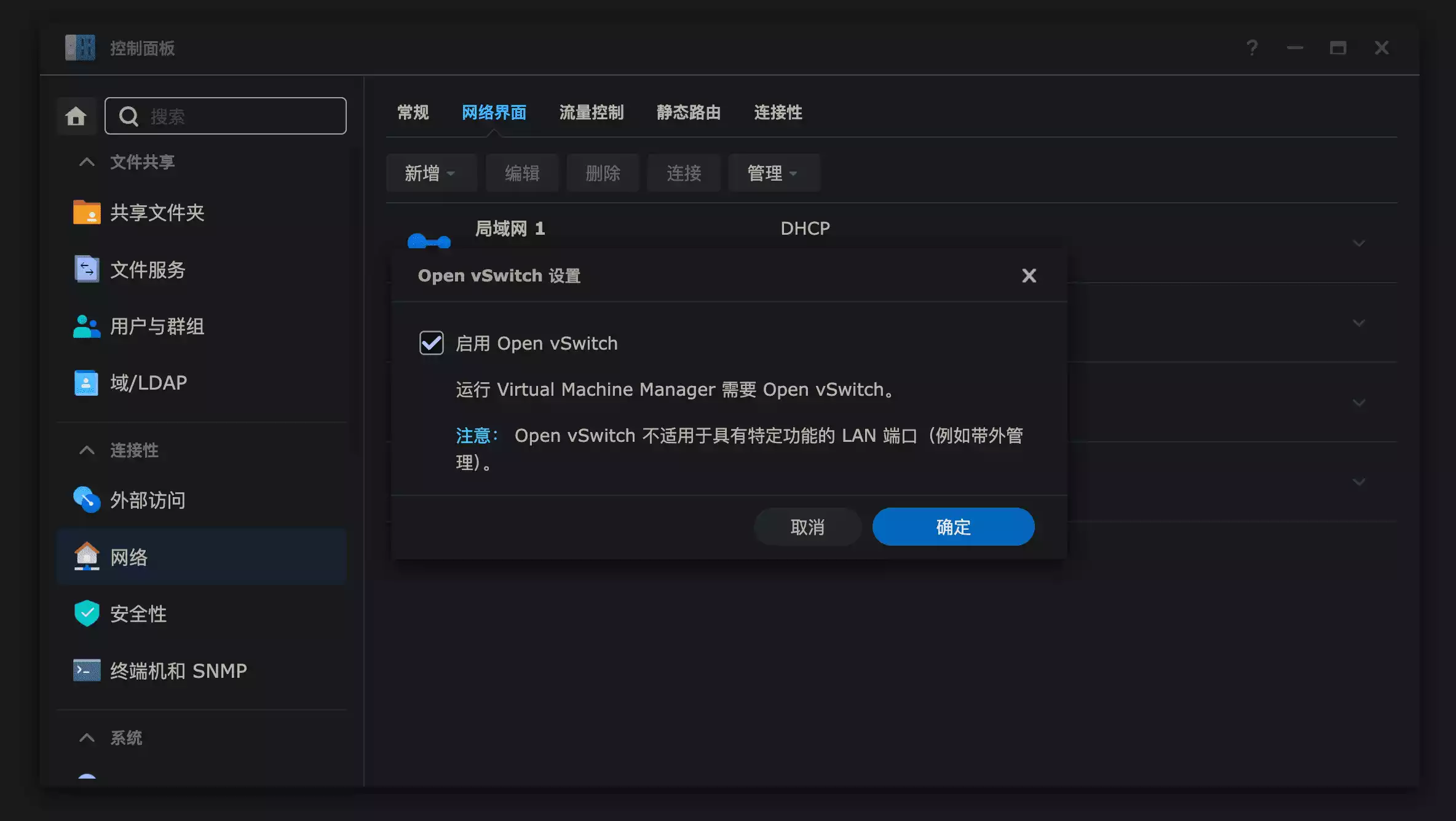 打开 控制面板 -> 网络 -> 网络界面 -> 管理 -> Open vSwitch 设置,勾选 启用 Open vSwitch 并确定。