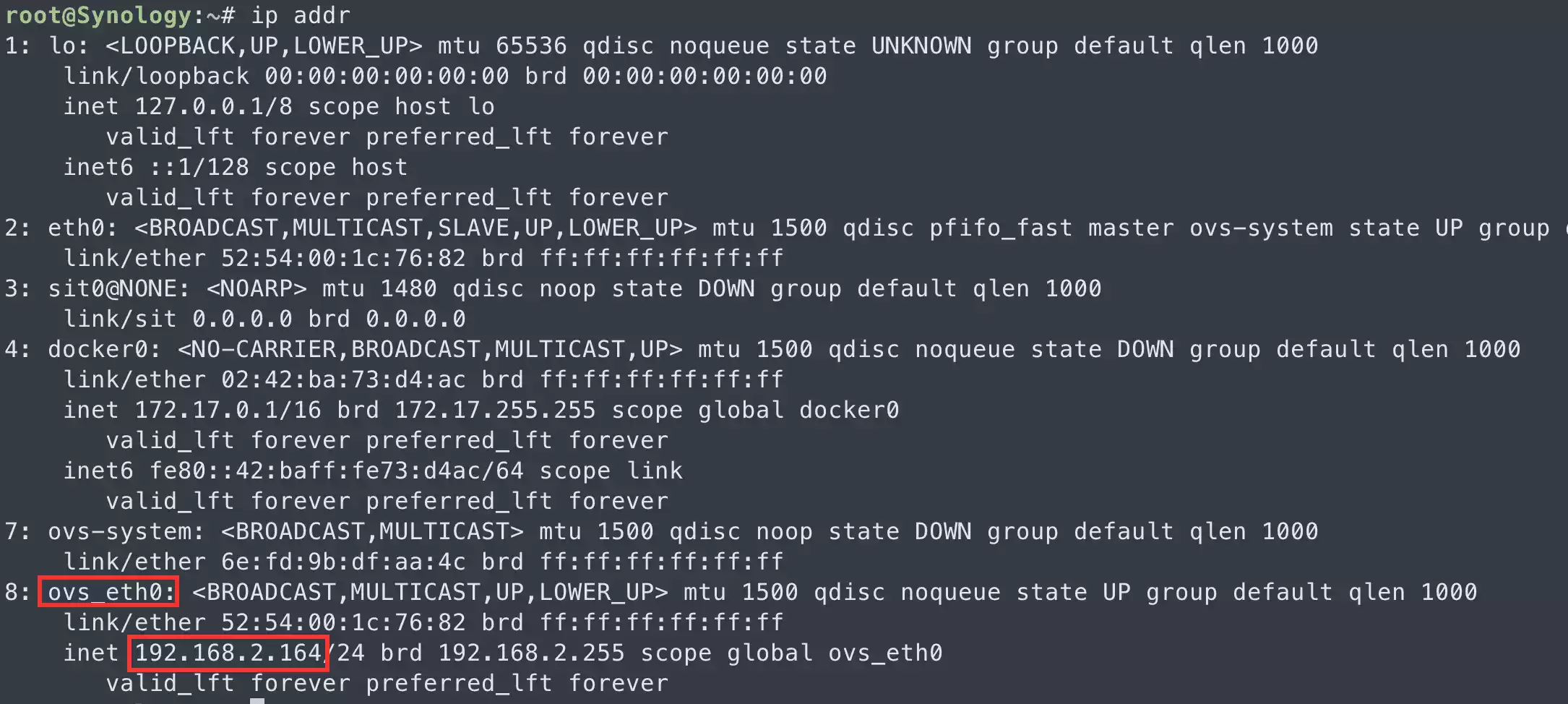 可以看到,开启 Open vSwitch 之后,群晖通过一个名为 ovs_eth0 的网桥来连接网络。
