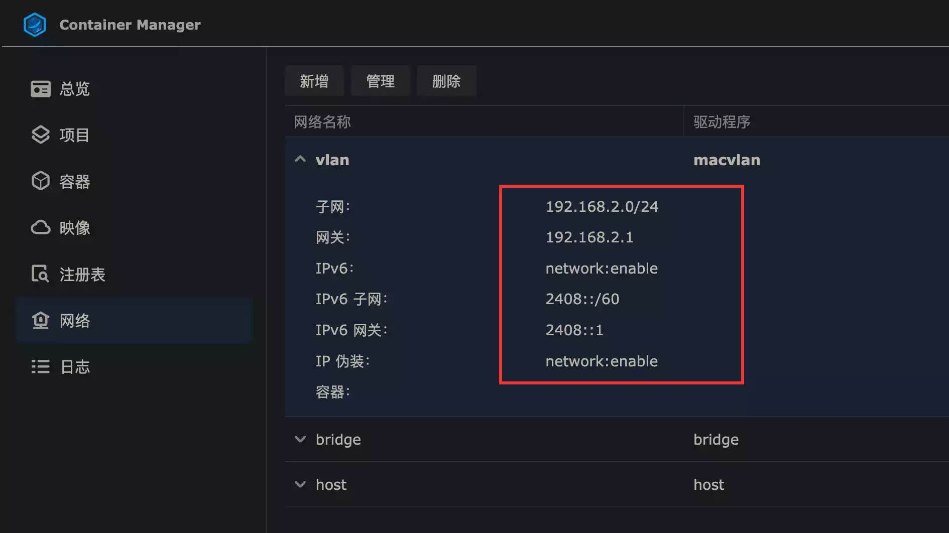 1 | #创建一个名为 vlan 的 macvlan 网络,IPv4 网关为主路由 192.168.2.1,IPv4 子网为 192.168.2.0/24,IPv6 网关为 2408::1,IPv6 子网为 2408::/60,ovs_eth0 为默认的网桥 |
