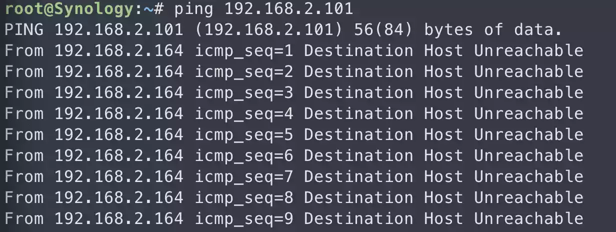 为了安全起见,macvlan 禁止宿主机和容器直接通信。以我的群晖为例,qBittorrent 容器的 IP 为 192.168.2.101,宿主机群晖的 IP 为 192.168.2.164,那么宿主机和容器之间就无法通信。