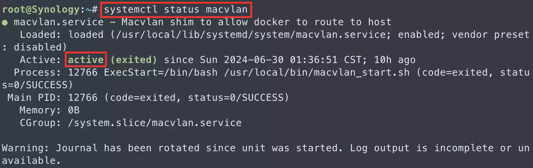 执行 systemctl enable macvlan 设置开机启动后,可以重启群晖用上面的 systemctl status macvlan 查看 macvlan 服务是否正常(显示绿色 active 表示已经启动)。