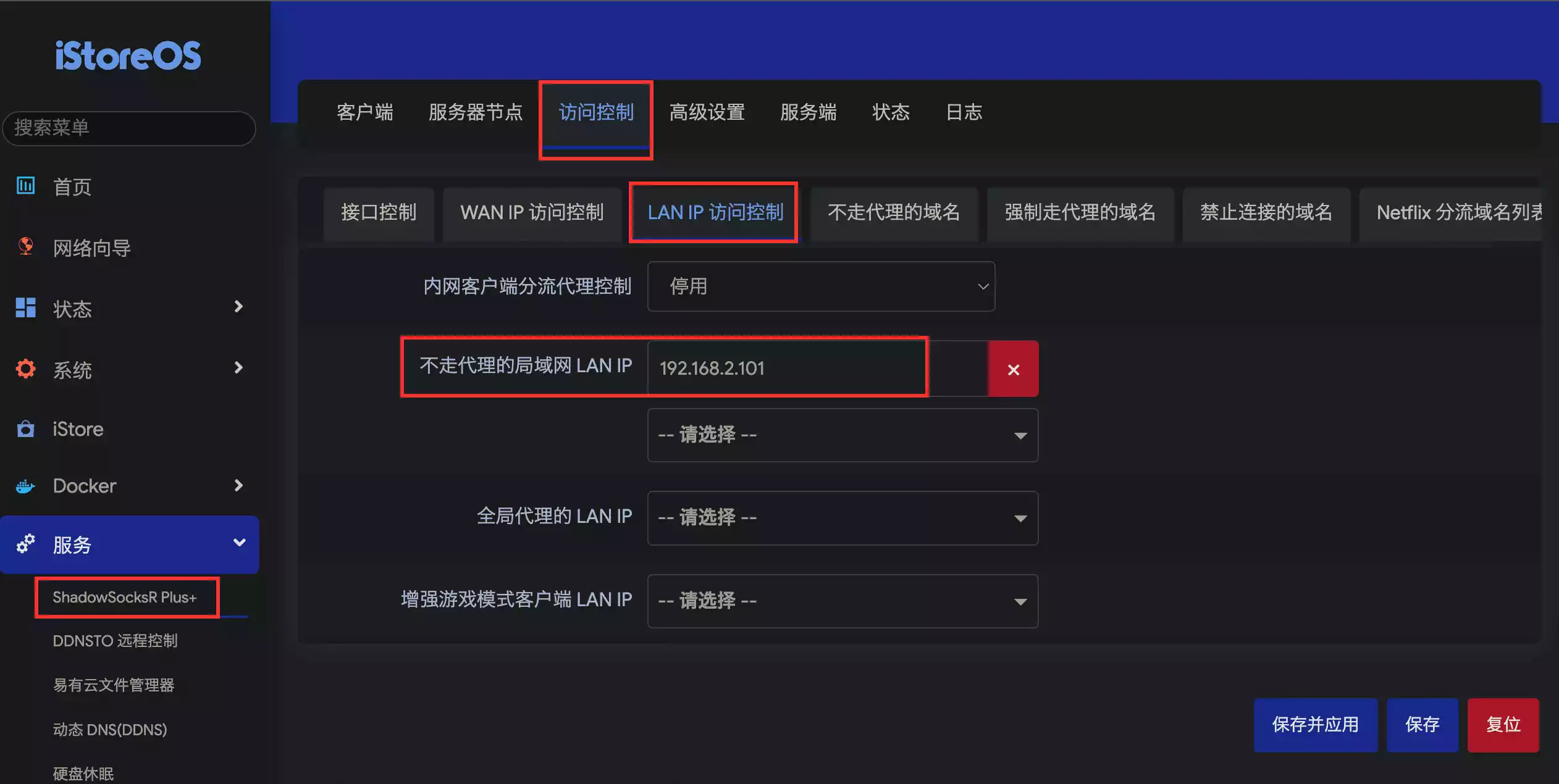 现在 qbittorrent 已经有独立的 IP(192.168.2.101),那么我们就可以在软路由的魔法插件中设置访问控制了。以 iStoreOS 中的 SSRP 插件为例:
