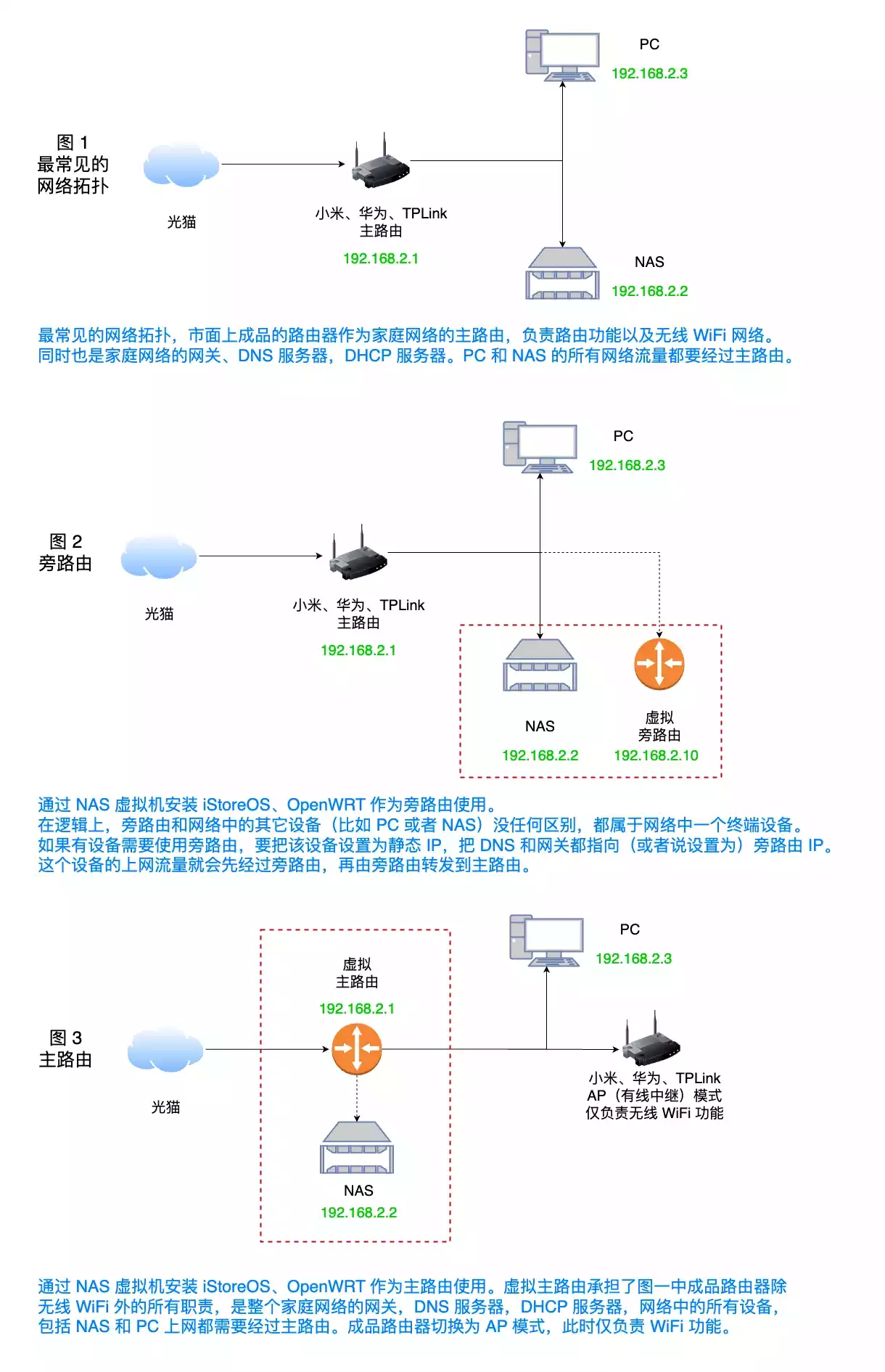 在安装软路由之前,可以先仔细看看下面这个图,了解各种网络拓扑的区别。