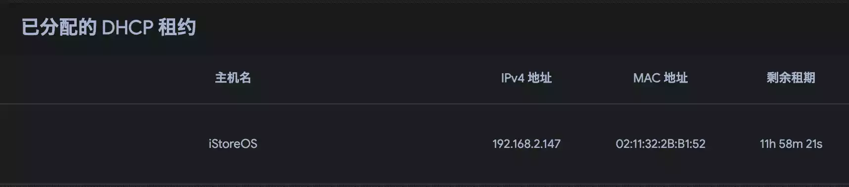 因为我们装的 iStoreOS 只有一个虚拟网卡,开机后会自动从主路由获取 IP 地址。