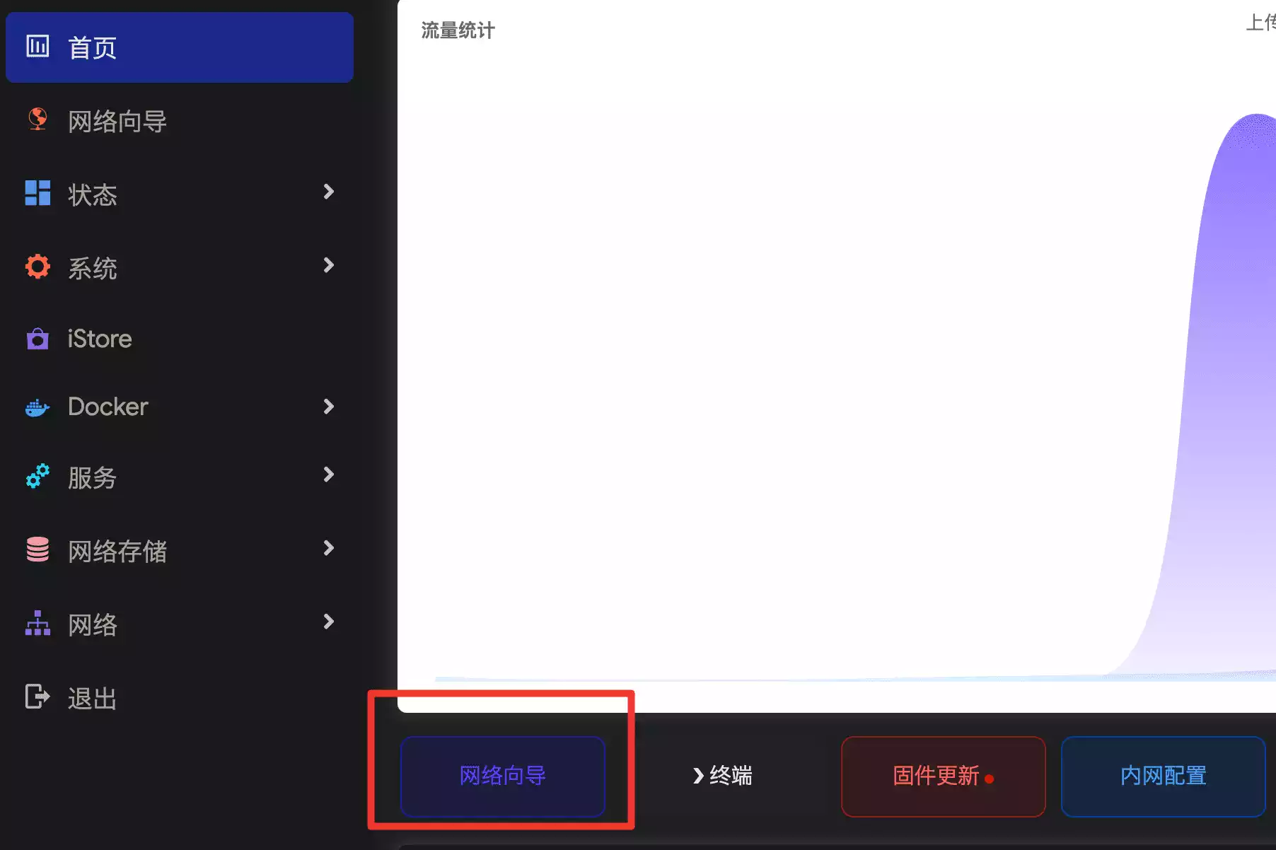 登录之后,直接点击首页的网络向导,设置为旁路由模式。