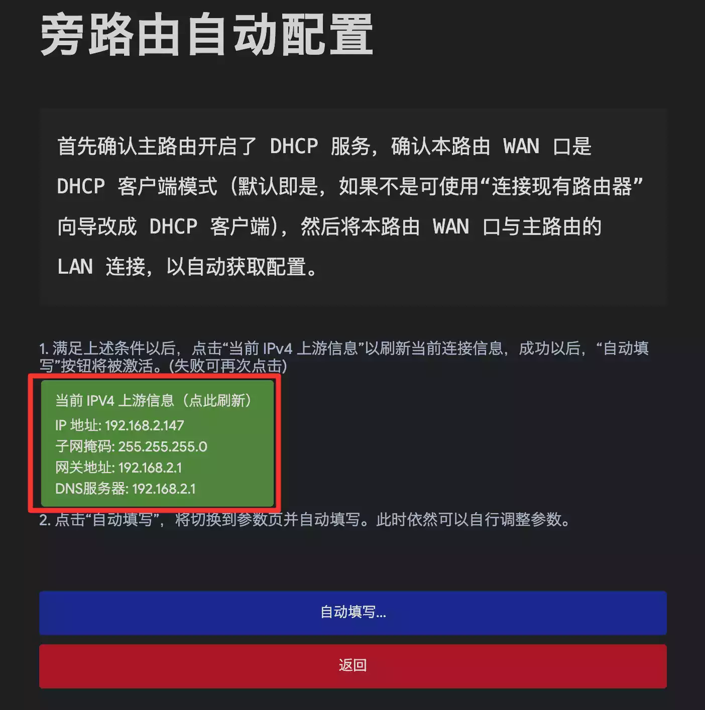 ,会自动刷新当前连接信息,点击 自动填写