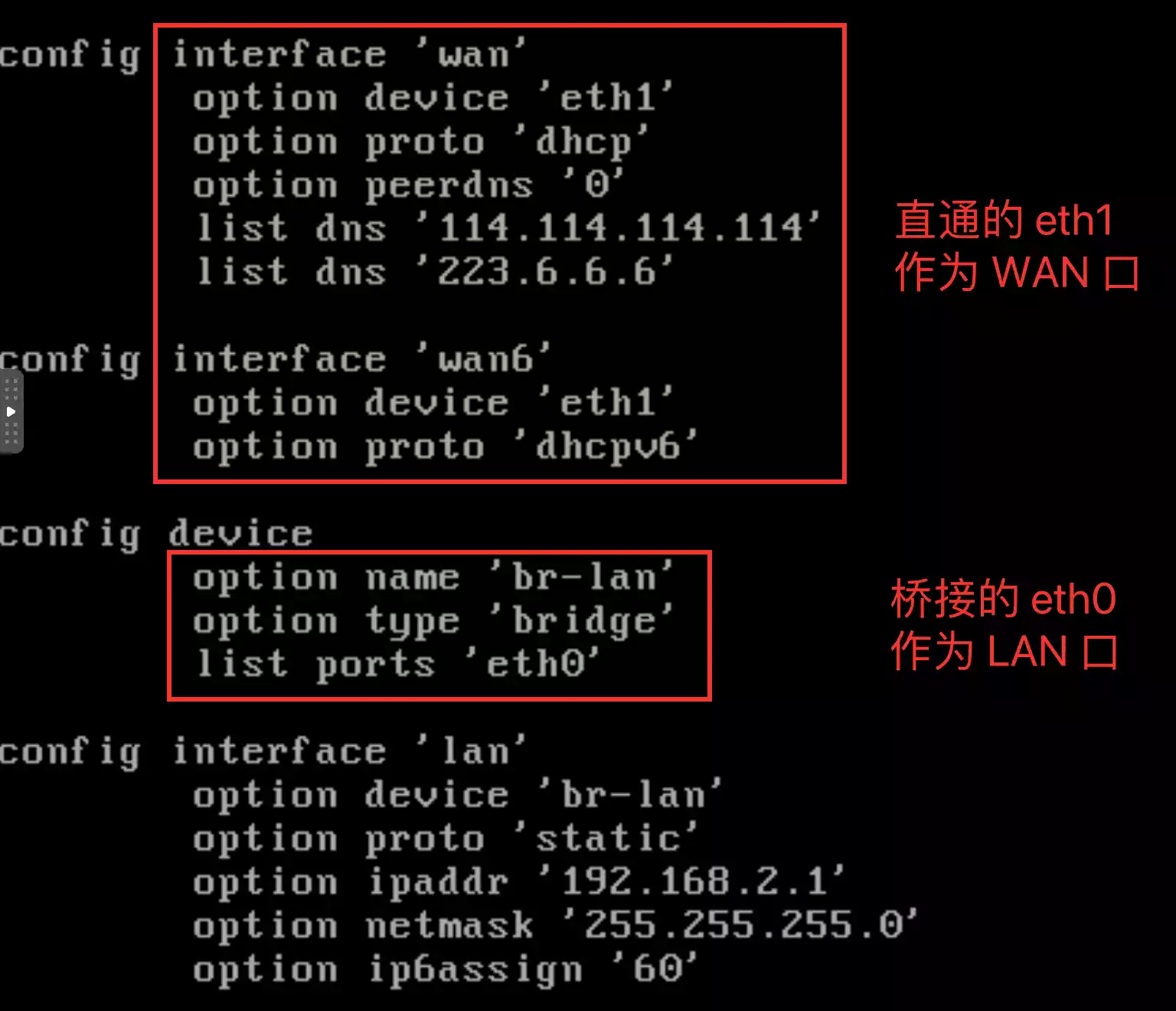 一般情况下,软路由中默认的 eth0 都是桥接的网卡,可以作为 LAN 口,其它的网卡(比如直通的网卡)可以作为 WAN 口。