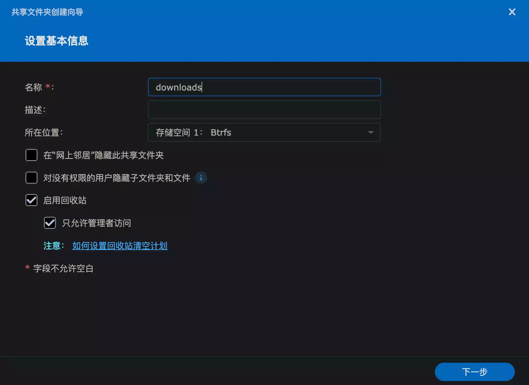 到 控制面板 -> 共享文件夹 中创建一个共享文件夹,例如 downloads。