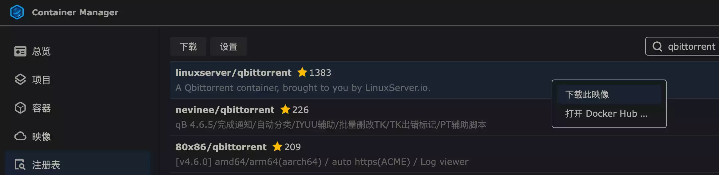 推荐使用 Docker 版的 qBittorrent。在 Container Manager -> 注册表 中搜索 qBittorrent,下载 linuxserver/qbittorrent,版本选择 lastest。