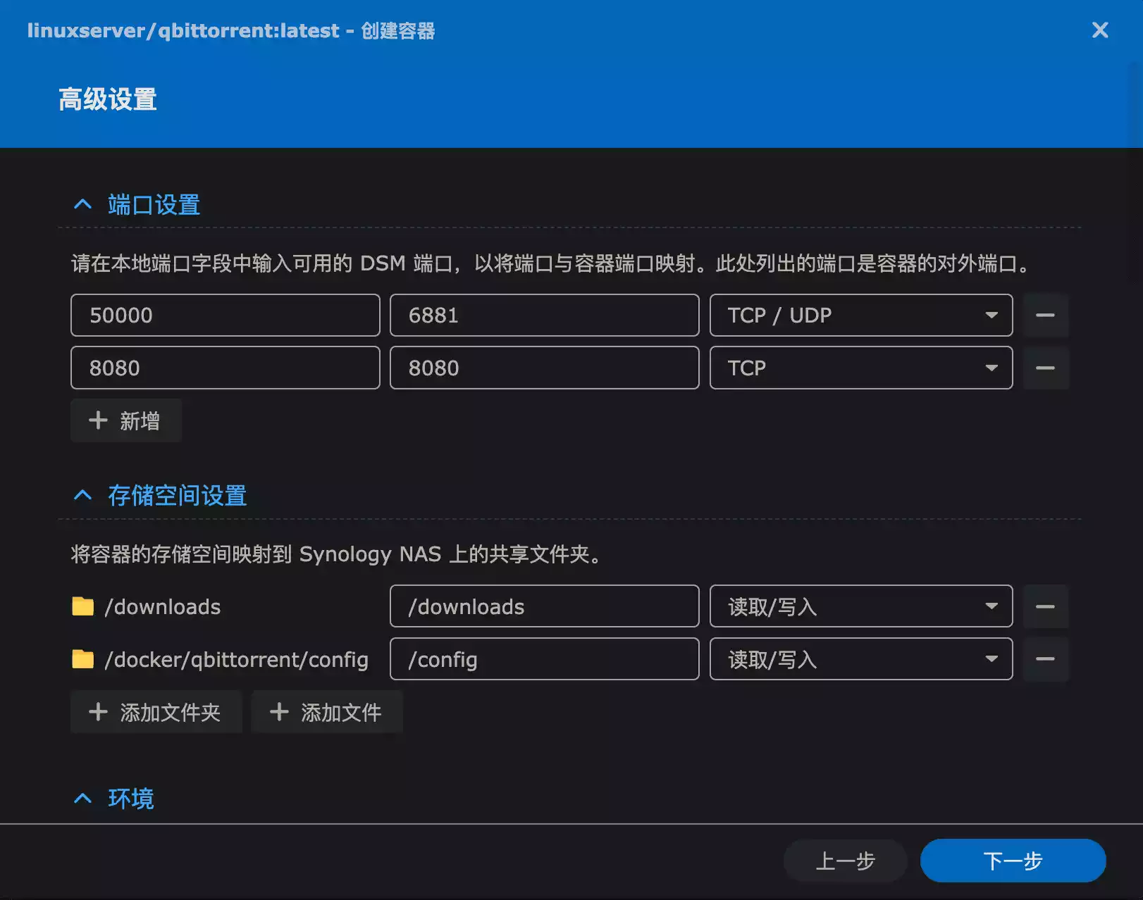 之后点击下一步,直到完成,qbittorrent 的 Docker 容器就已经启动了。默认的端口就是上面填写的 8080,使用 NAS IP:8080 访问。