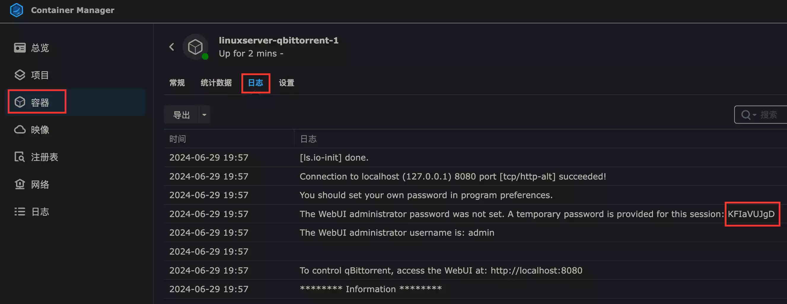 新版的 qbittorrent 默认密码需要到 日志 中查看,在该容器上面点击 详情 就可以看到 日志 标签,登录后可以修改密码。