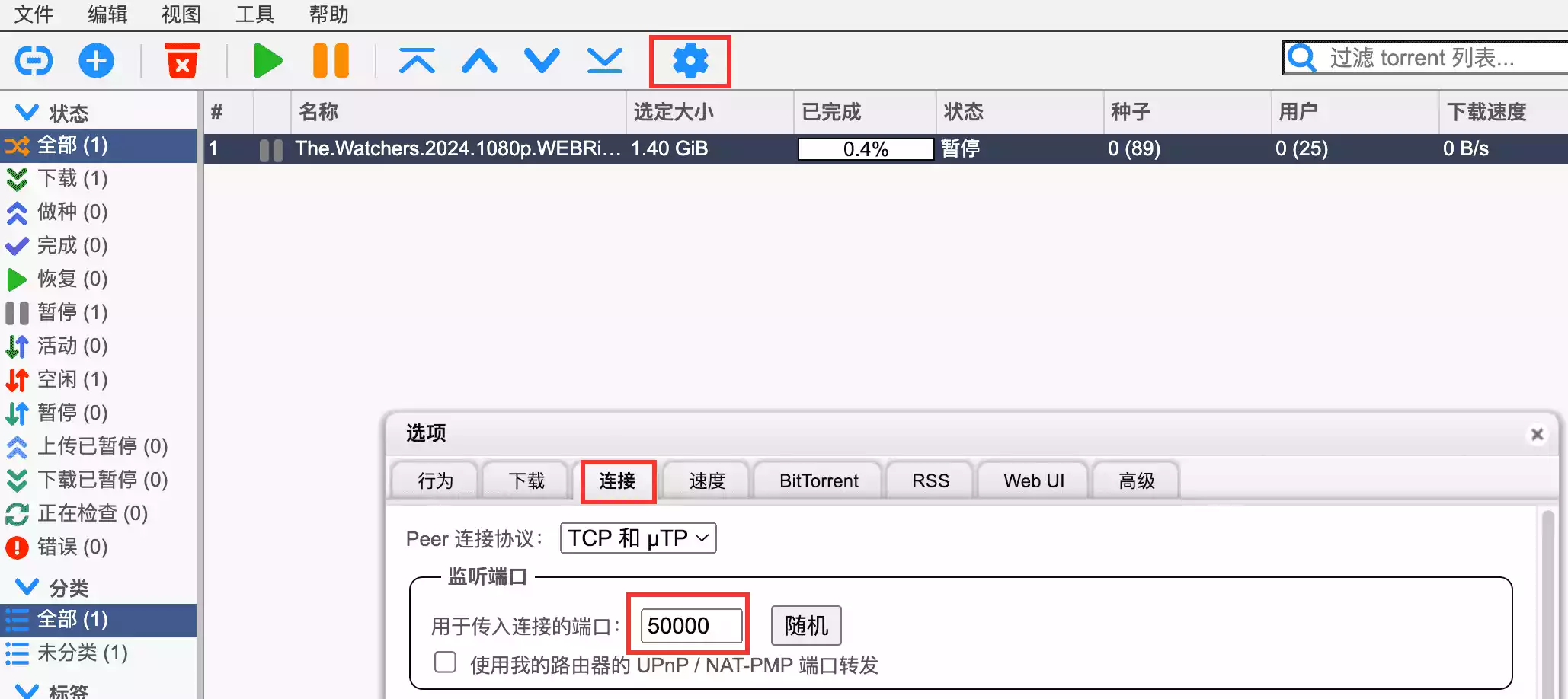 因此上面在安装的时候把容器的 6881 端口映射到了主机的 50000 端口,登录 qbittorrent 后需要在 连接 选项中,把默认的 6881 修改成上面的端口 50000,这样 PT 站点就可以正常下载了。当然你也可以映射到其他端口,前后保持一致即可。