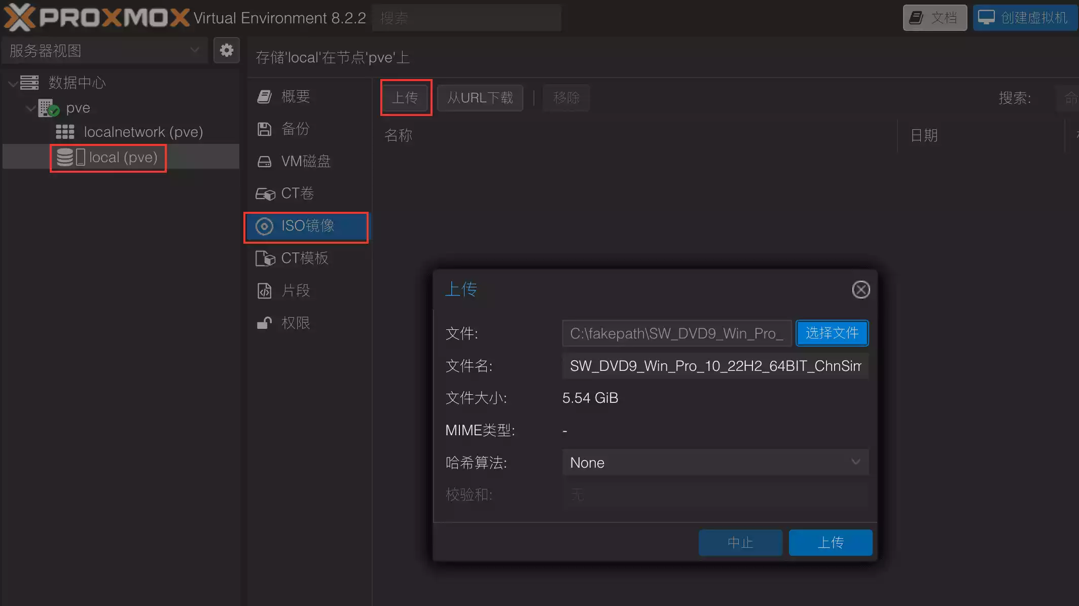 下载上面提供的 Windows 10 镜像以及 Virtio 驱动,你也可以自己从官网下载,并上传到 PVE 的 ISO 镜像