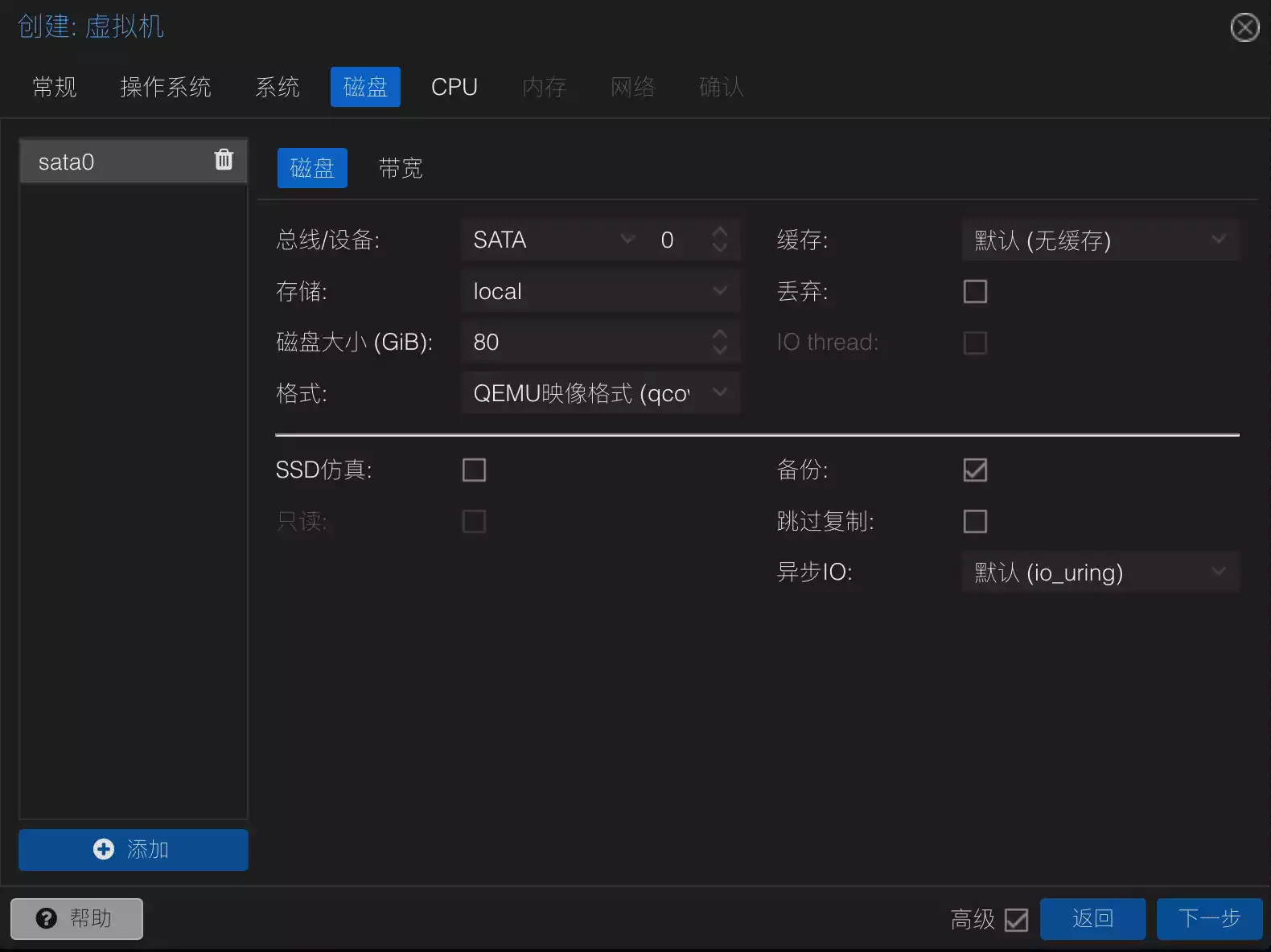,磁盘大小按你的实际情况来填写(建议至少 50G,也就是 Windows 的系统盘),点击下一步。