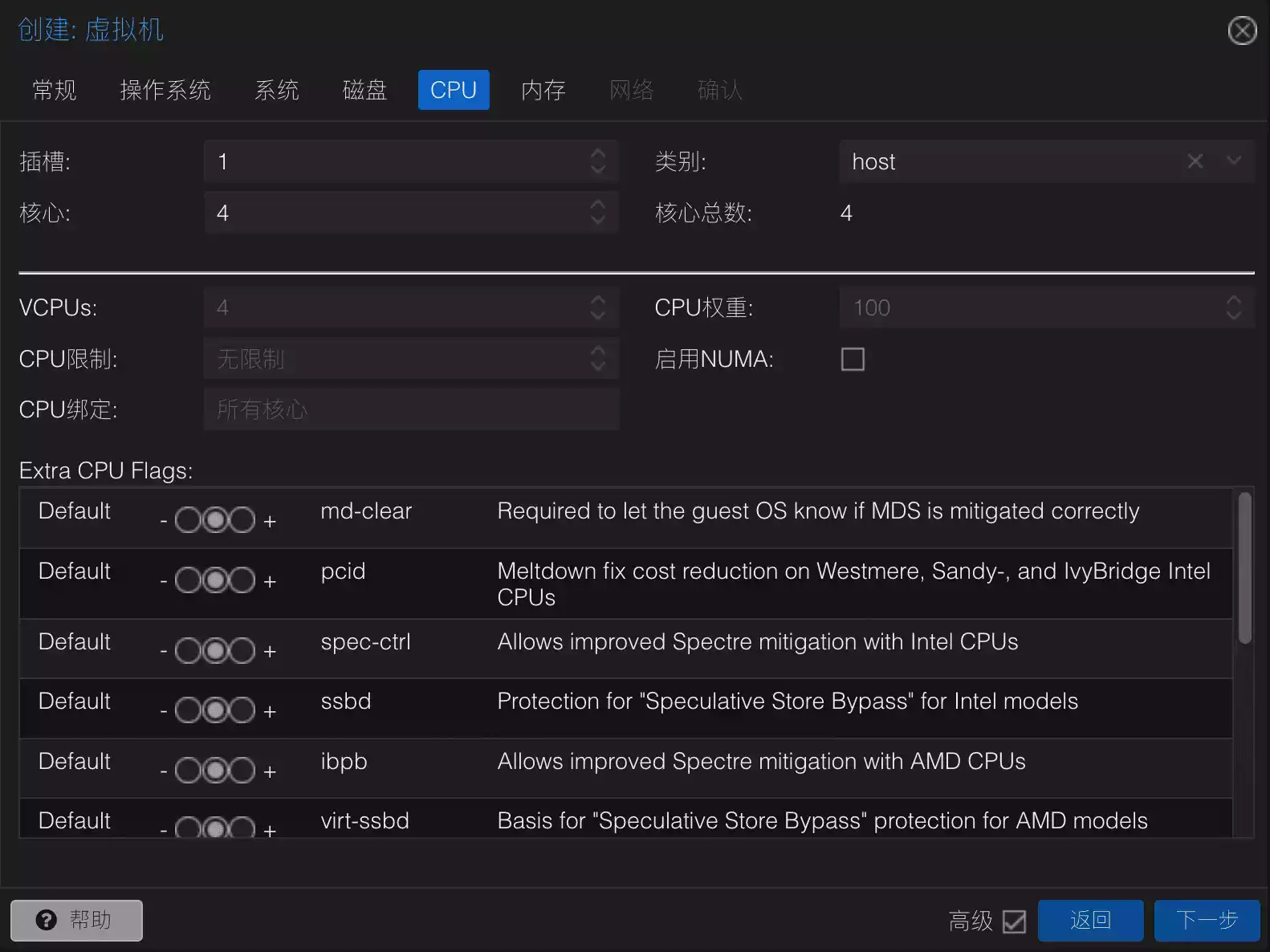 CPU 核心可以按需填写,最大不要超过 CPU 的物理核心数量,类别改成 host