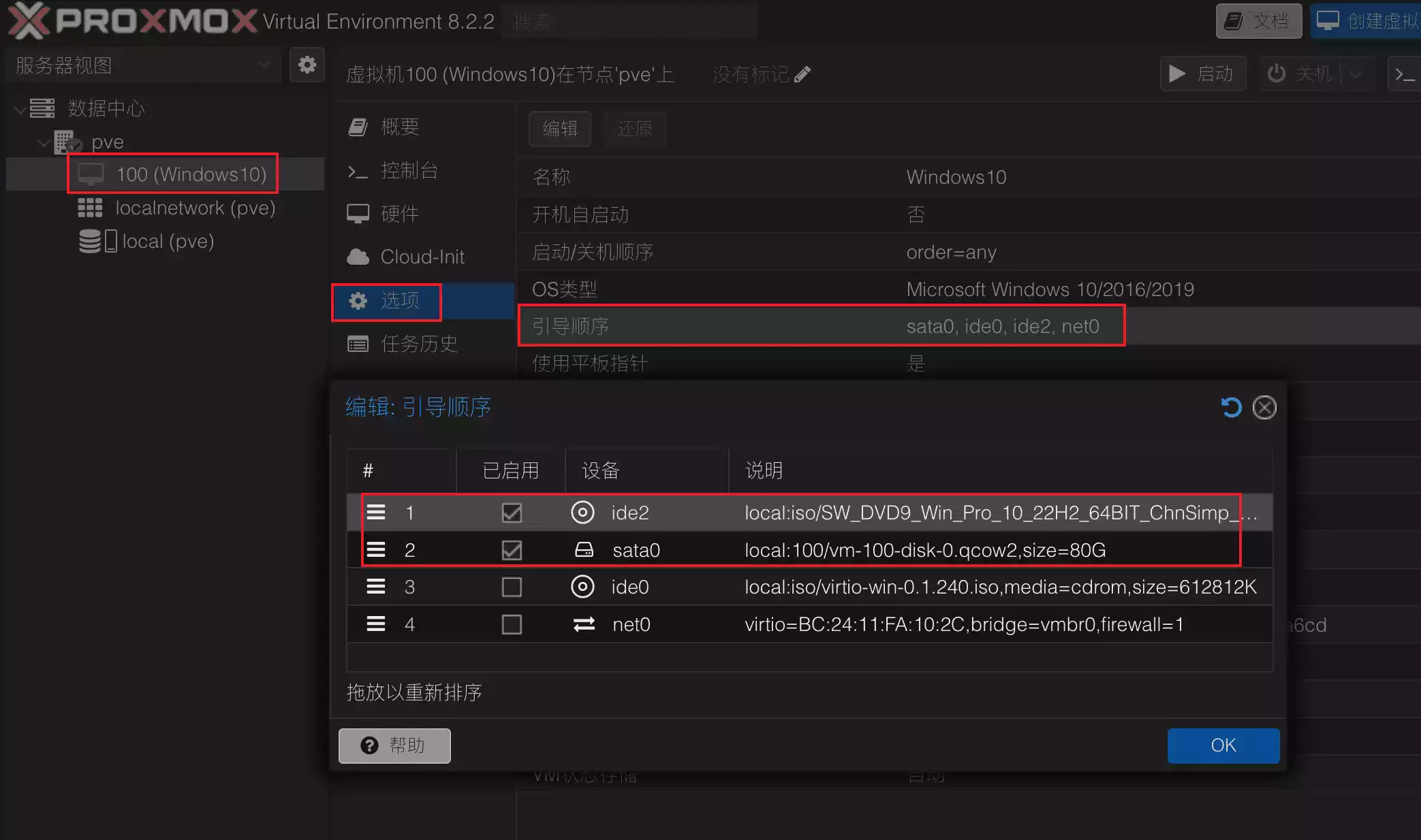 ,将 Windows 10 ISO 镜像设置为第一个启动,SATA 磁盘设置为第二个启动,其它的都取消勾选。如果需要 Windows 开机自启,也可以将 开机自启动
