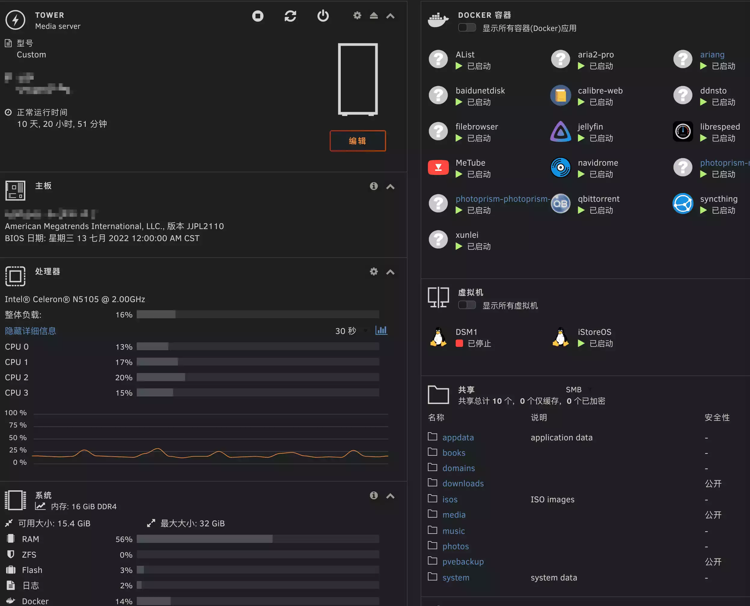 Unraid 的控制面板设计的比较清晰明了,在仪表板这一个页面就可以查看 NAS 的几乎所有状态。CPU,GPU,内存,网络,磁盘阵列,Docker,虚拟机,共享文件夹,外接的 UPS 等都一览无余。并且 Docker 和虚拟机的基本的操作(启动,暂停等等)都可以直接在这个页面完成。模块化的布局即便对于新手来说也很容易上手。