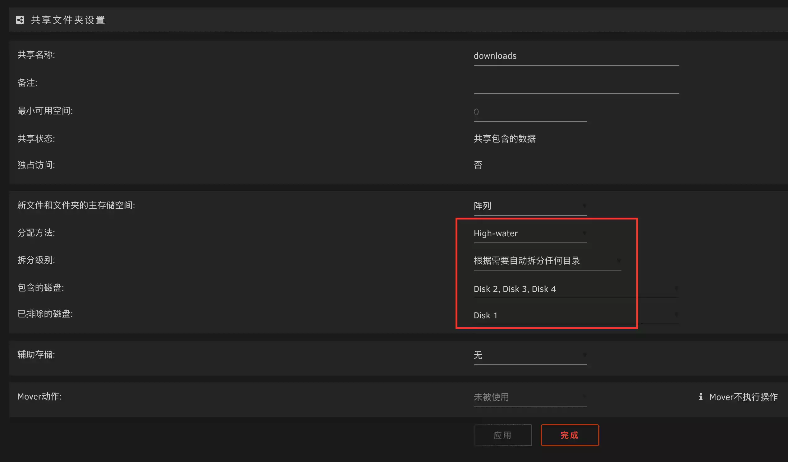 需要提一嘴的是,最好在创建文件夹的时候,就把这个文件夹打算存到哪里规划好。因为 Unraid 默认会把文件夹存到所有硬盘里,也就是每个硬盘都可能保存有这个文件夹的一部分。等到使用了一段时间之后再去改将会非常麻烦,因为这个时候,文件夹里的文件会散落在所有的硬盘上,手动合并比较麻烦。