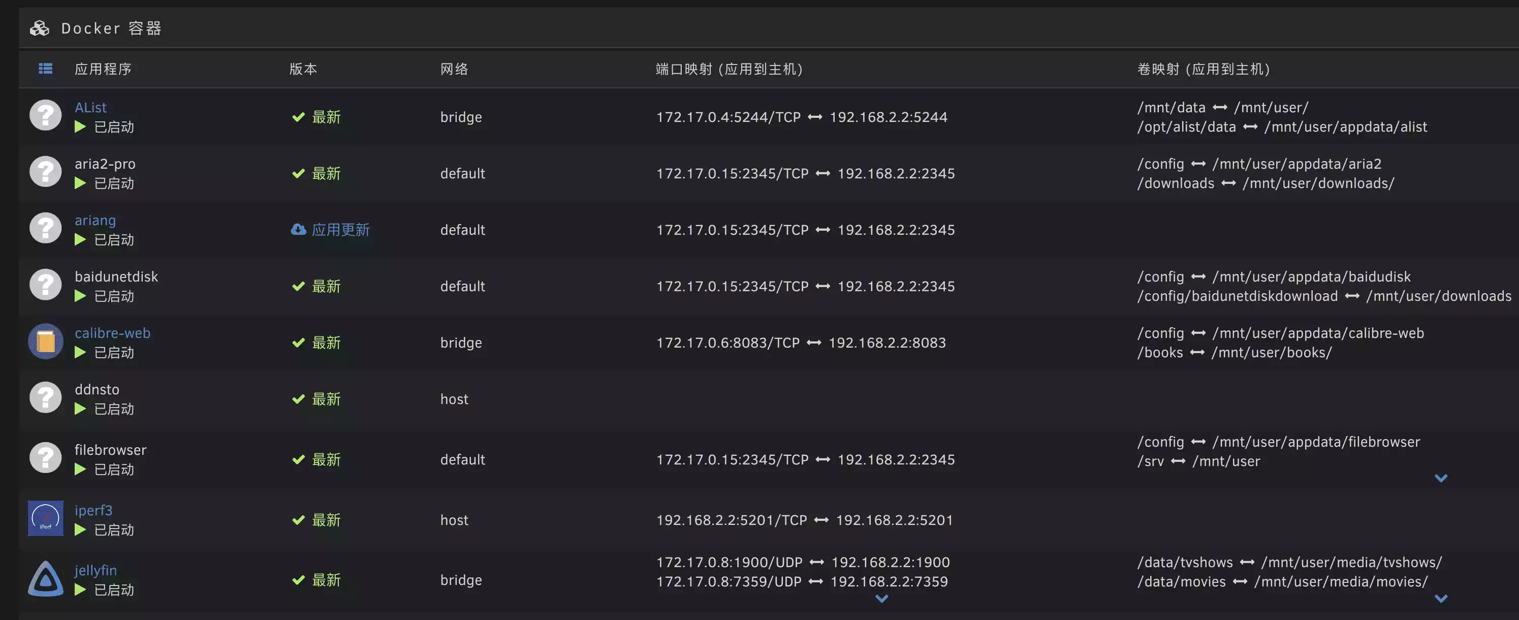 Unraid 自带的 Docker 管理面板非常直观,应用的基本信息在面板里都可以直接看到,如果想看到更多信息,还可以点击右上角的 基本视图/高级视图
