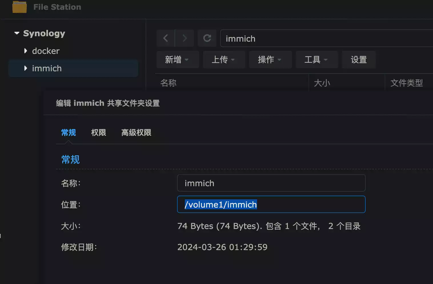 建立共享文件夹 immich 用来保存照片文件。共享文件夹建好之后,可以在 File Station 中右击选择属性查看文件夹的路径,记下备用。