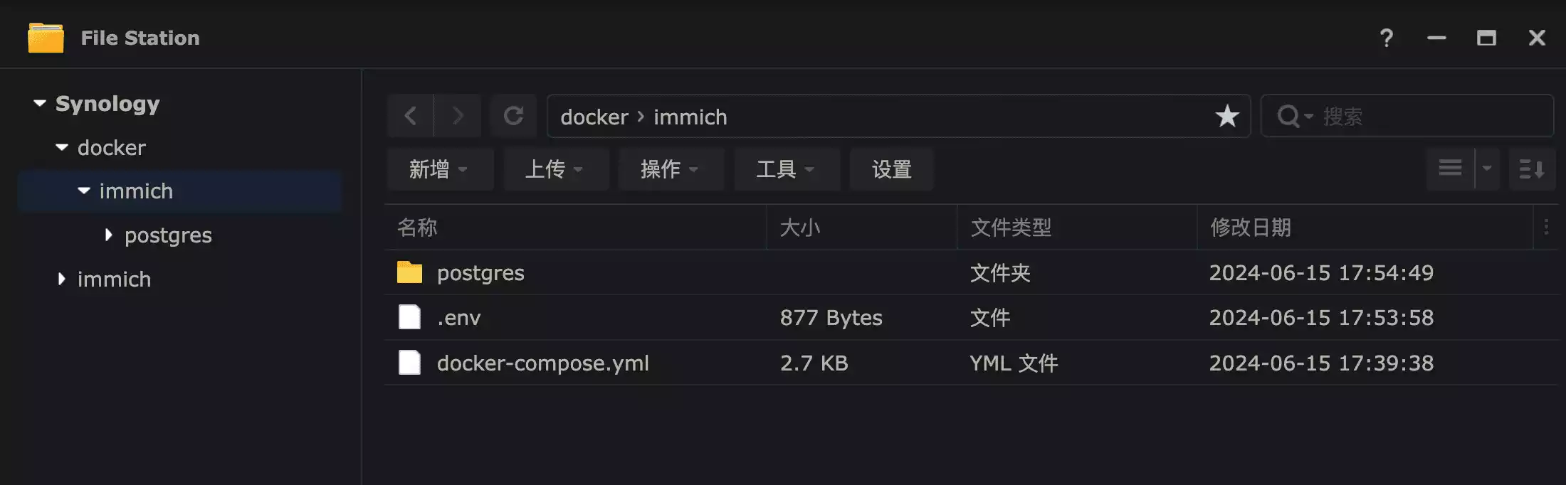 在 File Station 中的 docker 文件夹下面建立 immich 文件夹,用来保存配置文件。将修改好的 example.env 和 docker-compose.yml 上传到 /docker/immich 路径下面,并在 /docker/immich 下面建立 postgres 文件夹用来存储数据库,最后把 example.env 重命名为 .env。